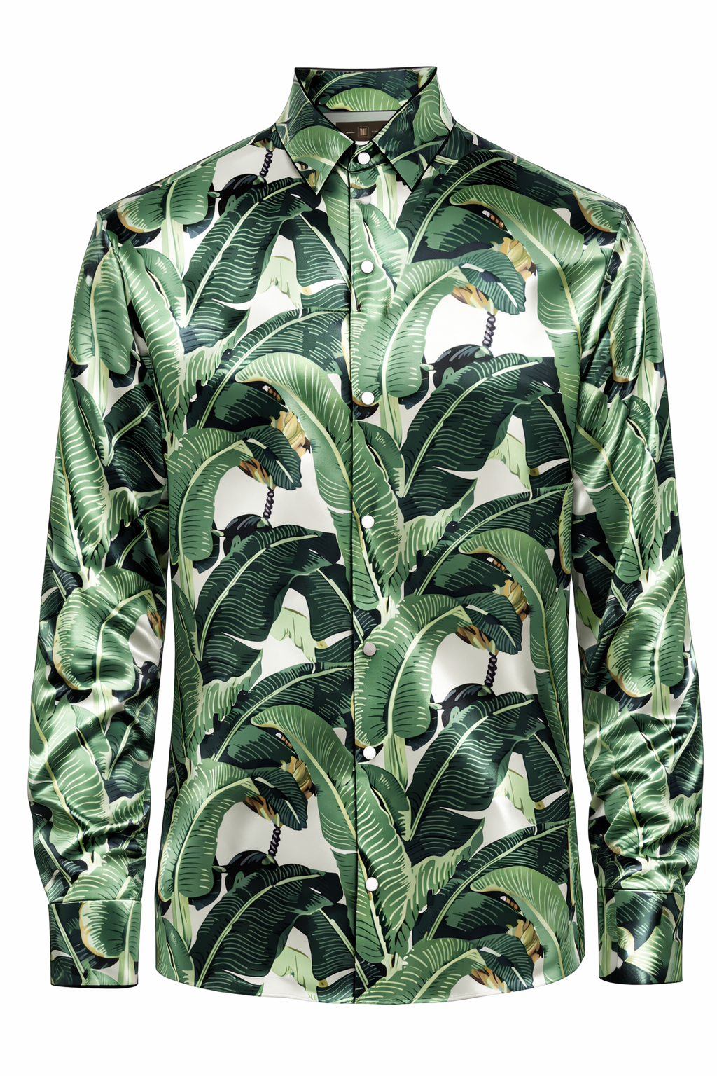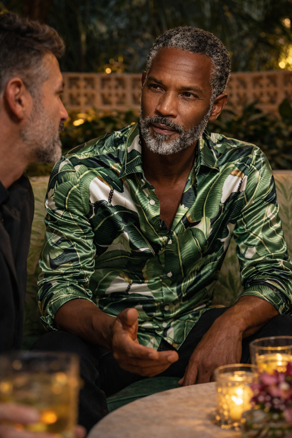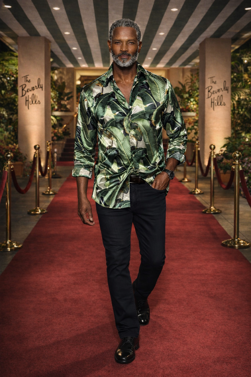 Samme ånd. Samme Beverly Hills-energi. Men skåret og syet specifikt til ham — semi-loose, flydende silk satin, der lyser op i aftenlyset. En skjorte, der fanger stearinlys som champagne fanger blitzlys. En skjorte, der ikke hvisker luksus — den forstår den.