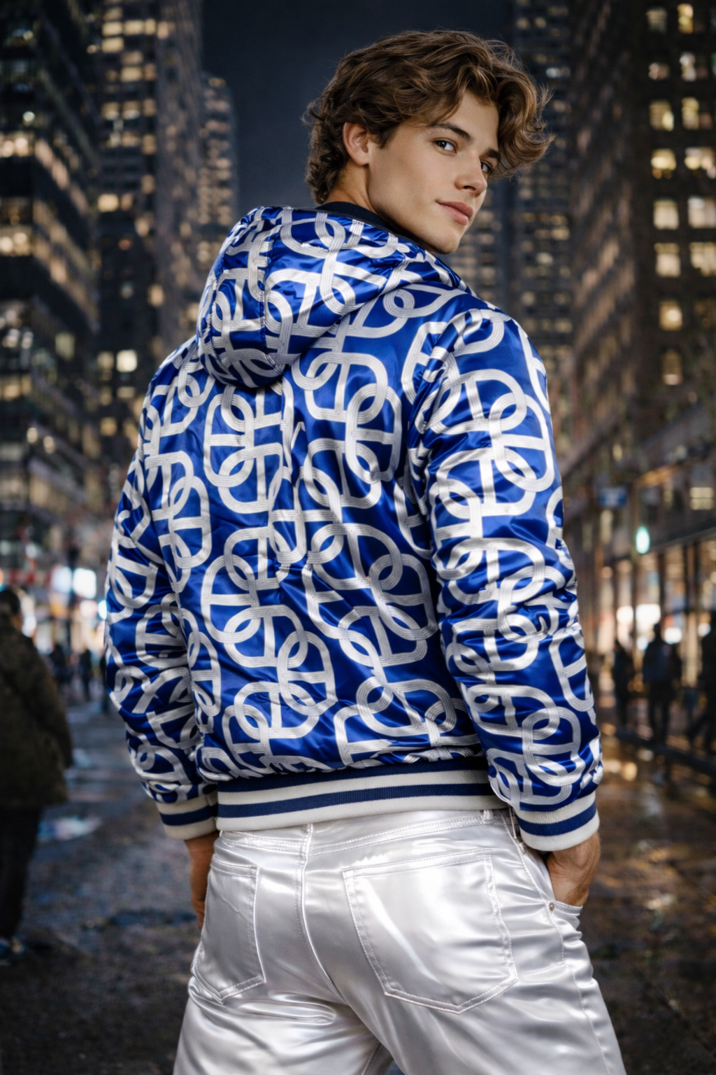The Blue Chain Print wraps the jacket in bold, interlocking graphics that echo ski runs, lift cables, and that unmistakable après-ski rhythm — graphic, kinetic, and impossible to ignore. Cut in ultra-smooth, high-gloss satin, the surface catches light like snow under floodlights, shifting as you move.