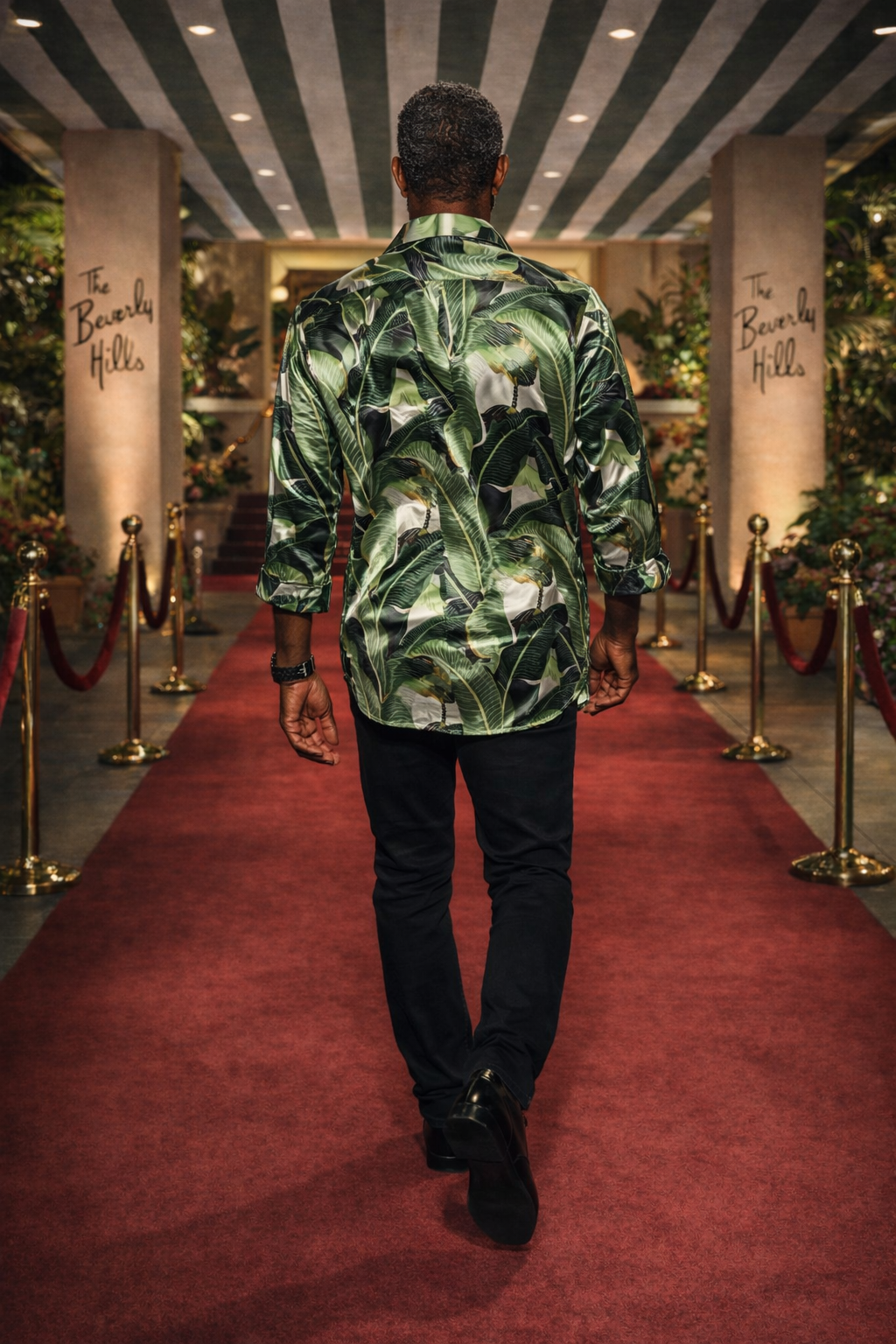 Same spirit. Same Beverly Hills energy. But cut and tailored specifically for him — semi-loose, liquid silk satin, luminous under evening light. A shirt that catches candles the way champagne catches flash bulbs. A shirt that doesn’t whisper luxury — it understands it.